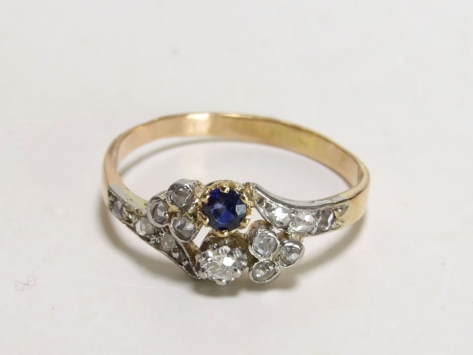 斜め(クロス)に2石がセットされることも多いですが、このリングでは縦にダイヤモンドとブルーサフ続きを見る