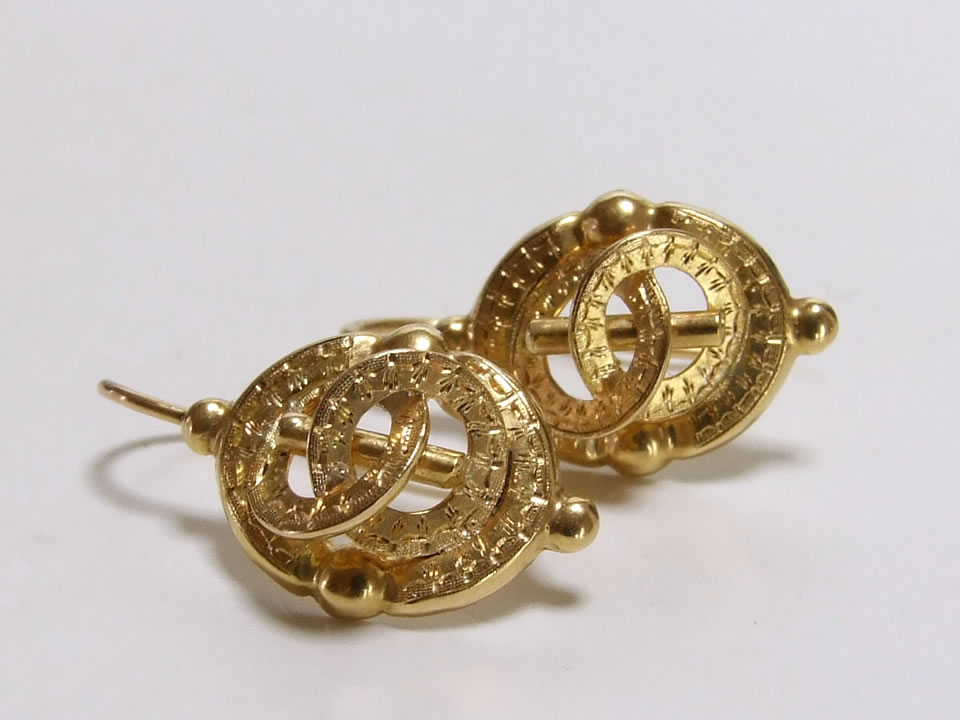 フランスのアンティークジュエリーでも特徴的な様式が見られる、フランス第二帝政期(1850-1870年頃)に作られたゴールドピアスです。